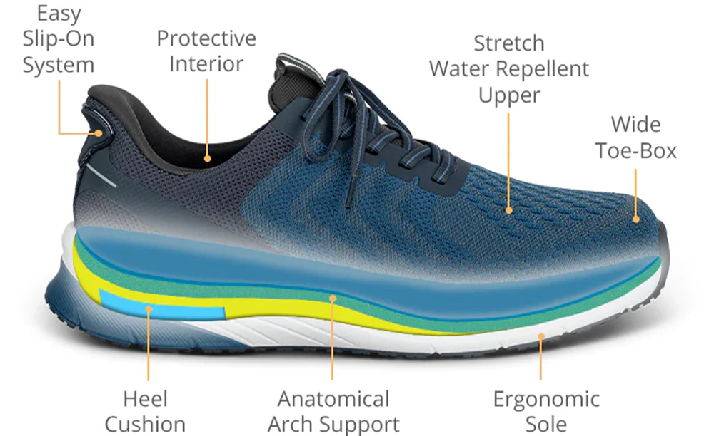 Orthofeet shoes feature an ergonomic sole with a mild rocker design, which promotes a natural gait and reduces strain on the feet and joints during walking. This design allows for smoother transitions between steps and minimizes fatigue, making Orthofeet shoes perfect for extended walking or standing periods.