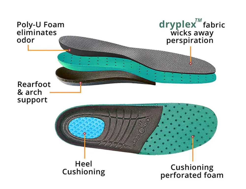 Innovative Ortho-Cushion™ System with premium orthotic insole and ergonomic cushioning sole soften impacts, improves the ease of walking and adds spring to your step.