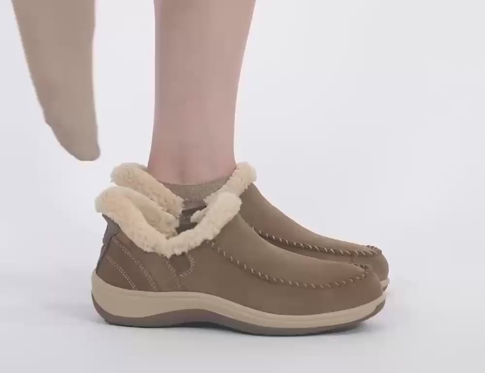 Saunter indoors or venture out with ease in the luxurious comfort of the Orthofeet Lorin Light Brown Women’s Slipper. Made from supple, water-repellent suede, these slipper-shoes provide a non-binding fit while keeping feet warm with a cozy faux fur lining. Thanks to the hands-free slip-on technology, there’s no need to bend down—simply step in and go. The revolutionary heel design ensures they stay securely in place while walking.