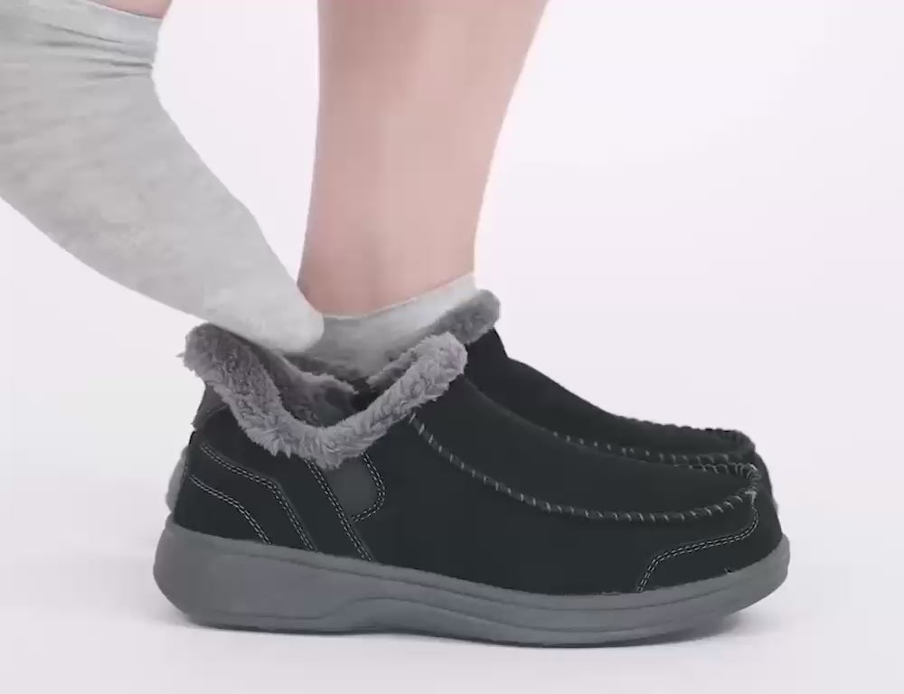 The Orthofeet Vito Black blends the warmth of a slipper with the support and protection of a shoe, making it perfect for both indoor lounging and outdoor errands. Featuring a tailored suede upper and lined with soft faux fur, these shoes keep your feet warm while offering superior comfort and support. With the hands-free design, you can simply step in—no bending or tying required, making it ideal for those with back pain or mobility challenges.